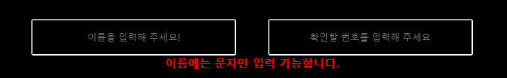 <p id="required" style="display: none; color: red">이름에는 문자만 확인할 번호는 숫자만 입력 가능합니다.</p>