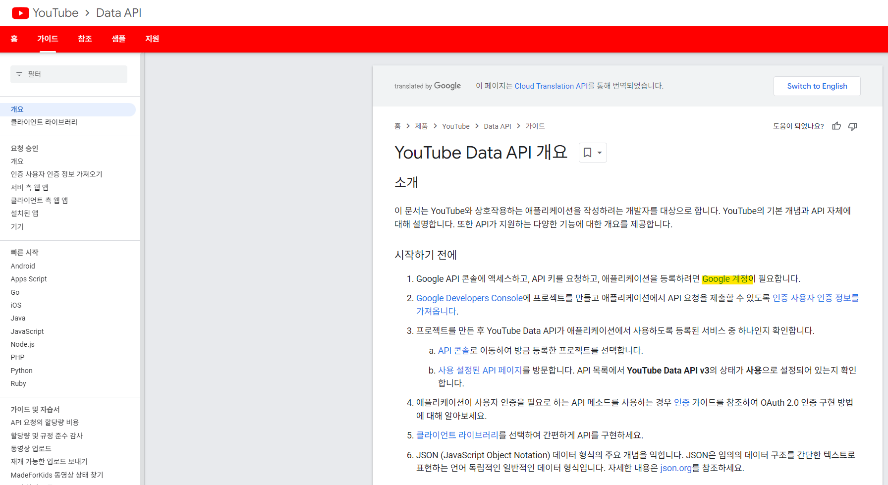 https://developers.google.com/youtube/v3/getting-started?hl=ko