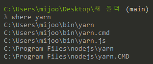 Cmder에서 yarn 을 읽어오는 경로 확인 = where yarn